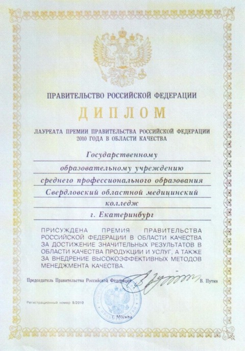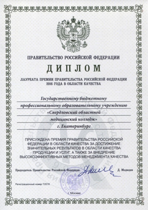 СВЕРДЛОВСКИЙ ОБЛАСТНОЙ МЕДИЦИНСКИЙ КОЛЛЕДЖ - ЛАУРЕАТ ПРЕМИЙ ПРАВИТЕЛЬСТВА РОССИЙСКОЙ ФЕДЕРАЦИИ В ОБЛАСТИ КАЧЕСТВА